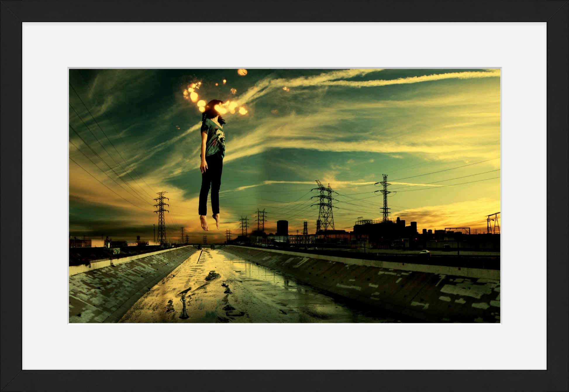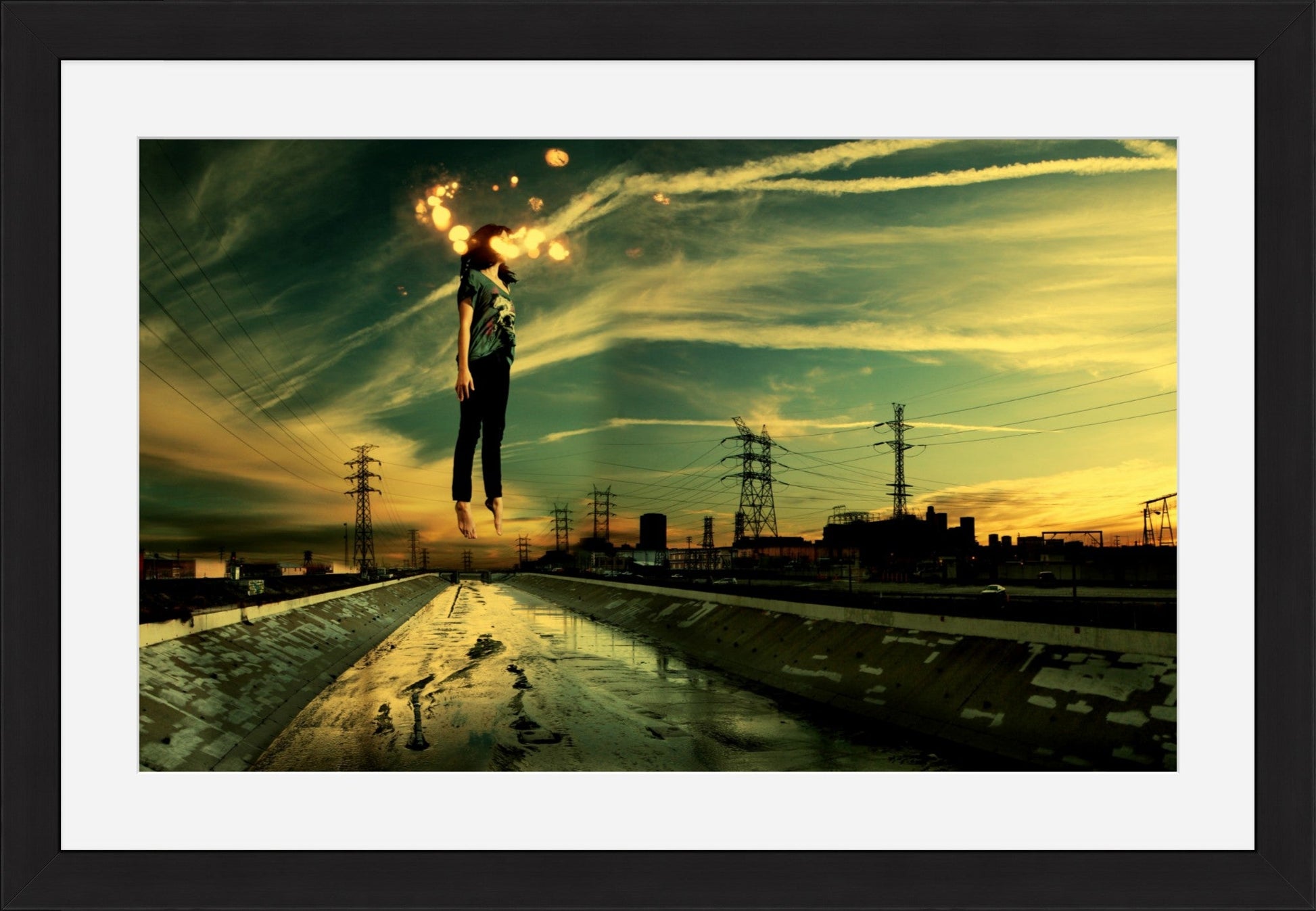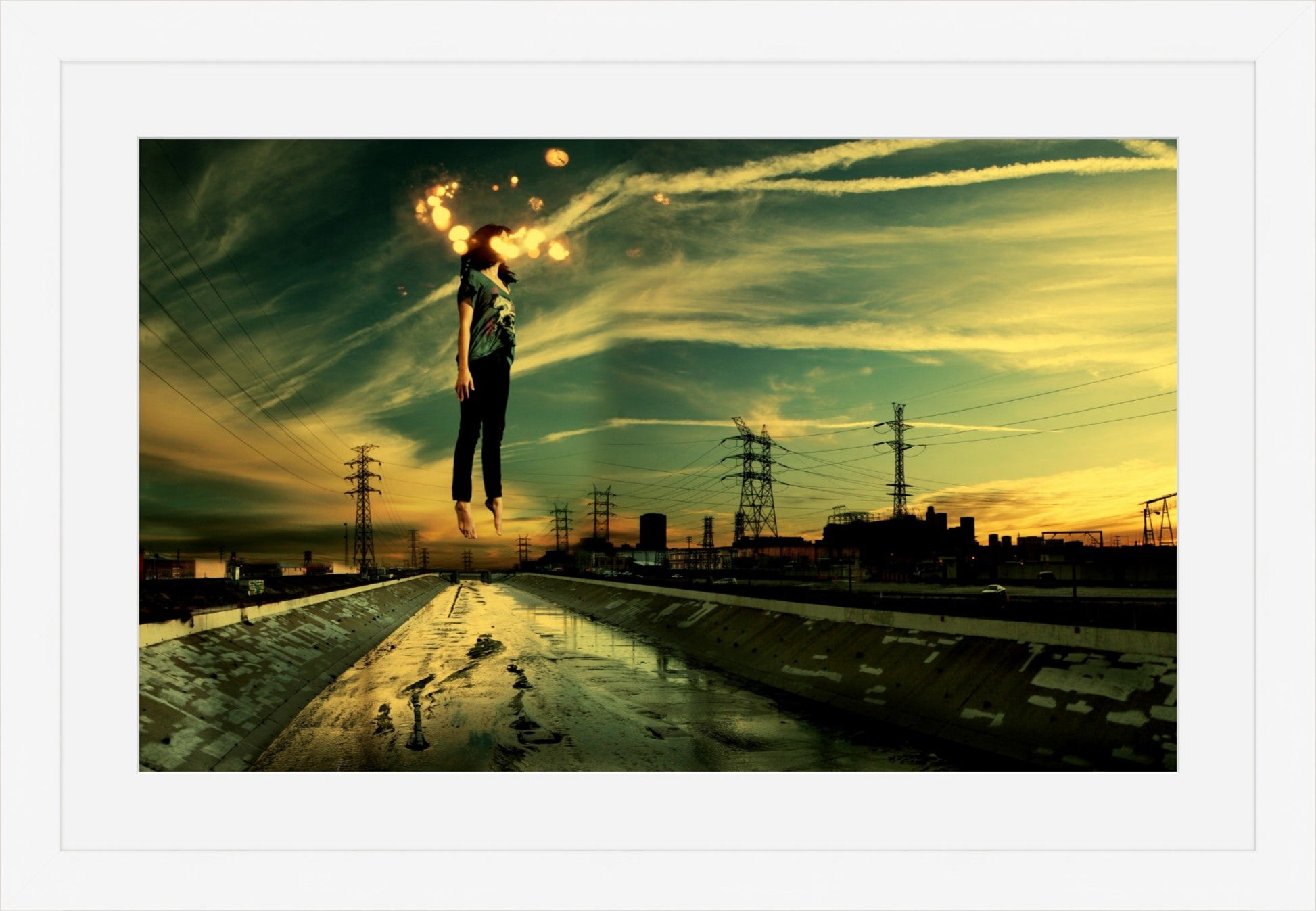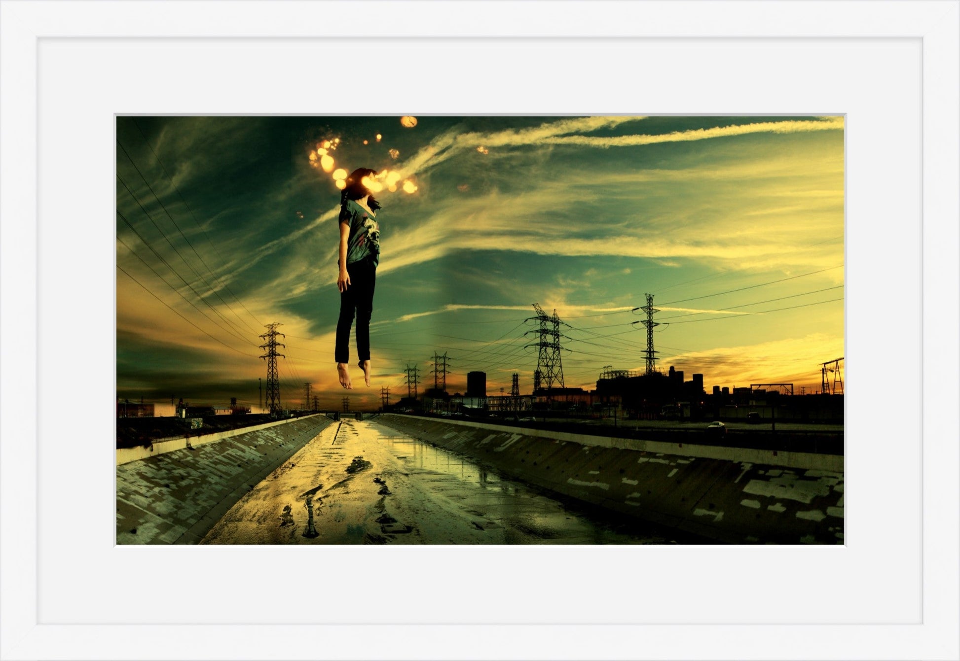 "Light Theory #1" is a digital collage featuring a woman floating above the LA River skyline at sunset. Set against a backdrop of green and yellow tones, the image is layered with cloud streaks and sparks of light. It captures a sense of weightlessness and freedom, exploring the space where reality and imagination meet.