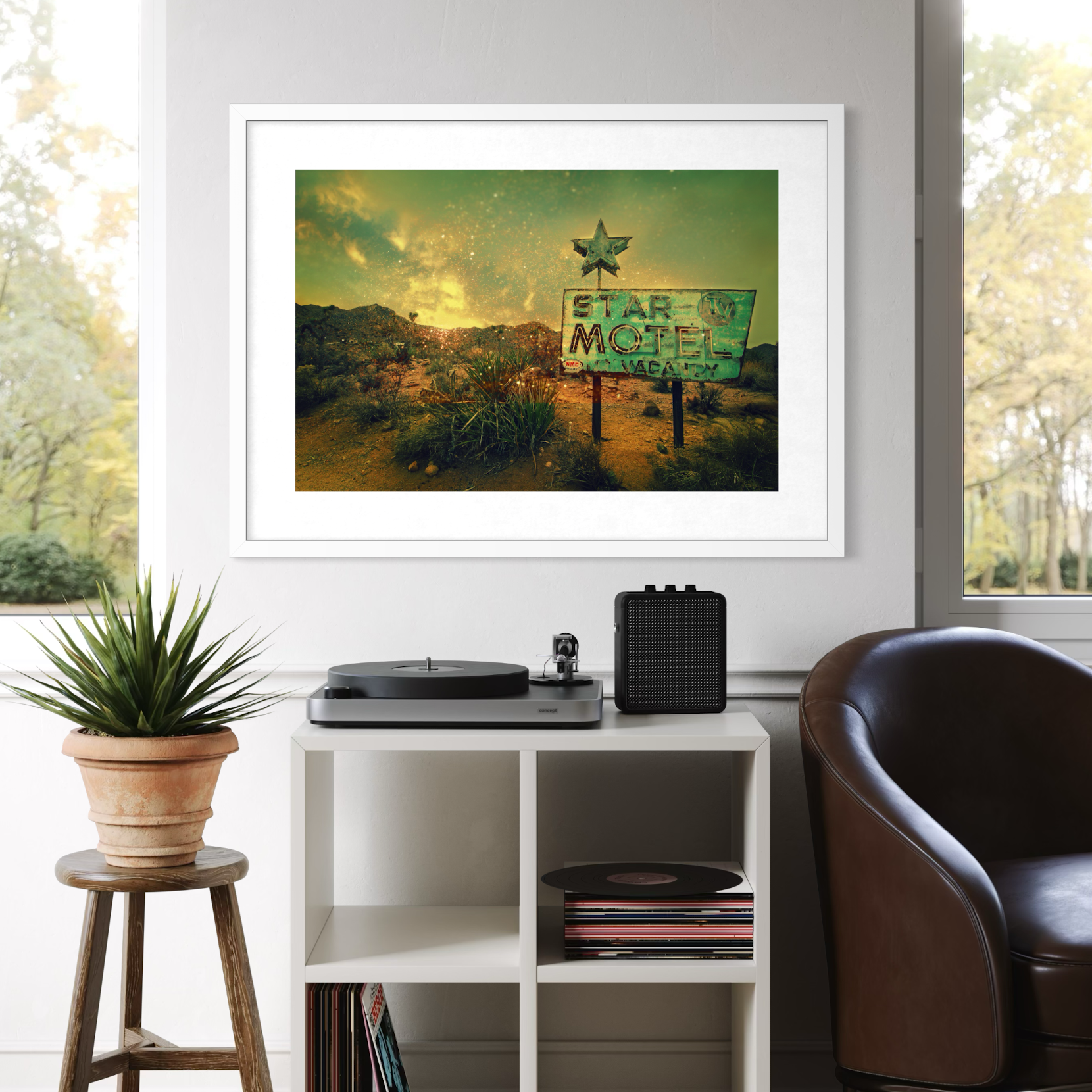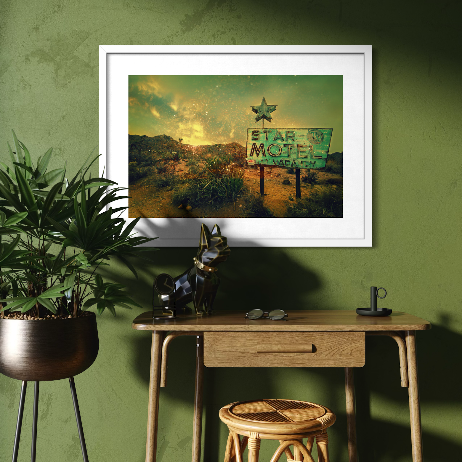 "The Desert Star" is a fine art portrait of American obsolescence. This 1950s relic stands isolated against the vast desert horizon, its mid-century geometry contrasting with the organic sprawl of the landscape. Saturated in nostalgic golds and sage greens, the image is layered with digital artifacts that mimic the static of a fading memory. It transforms a roadside ruin into a weathered, cinematic monument to a bygone era—a perfect statement piece for the modern interior.