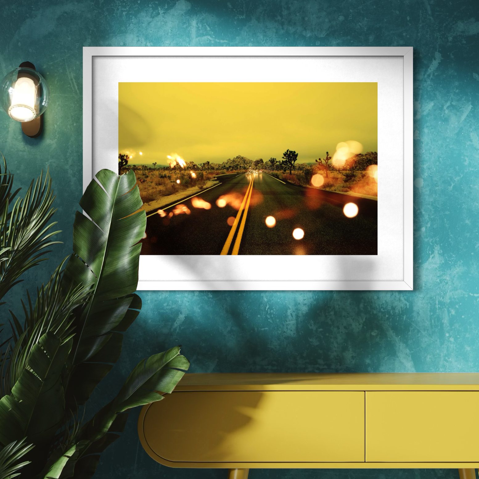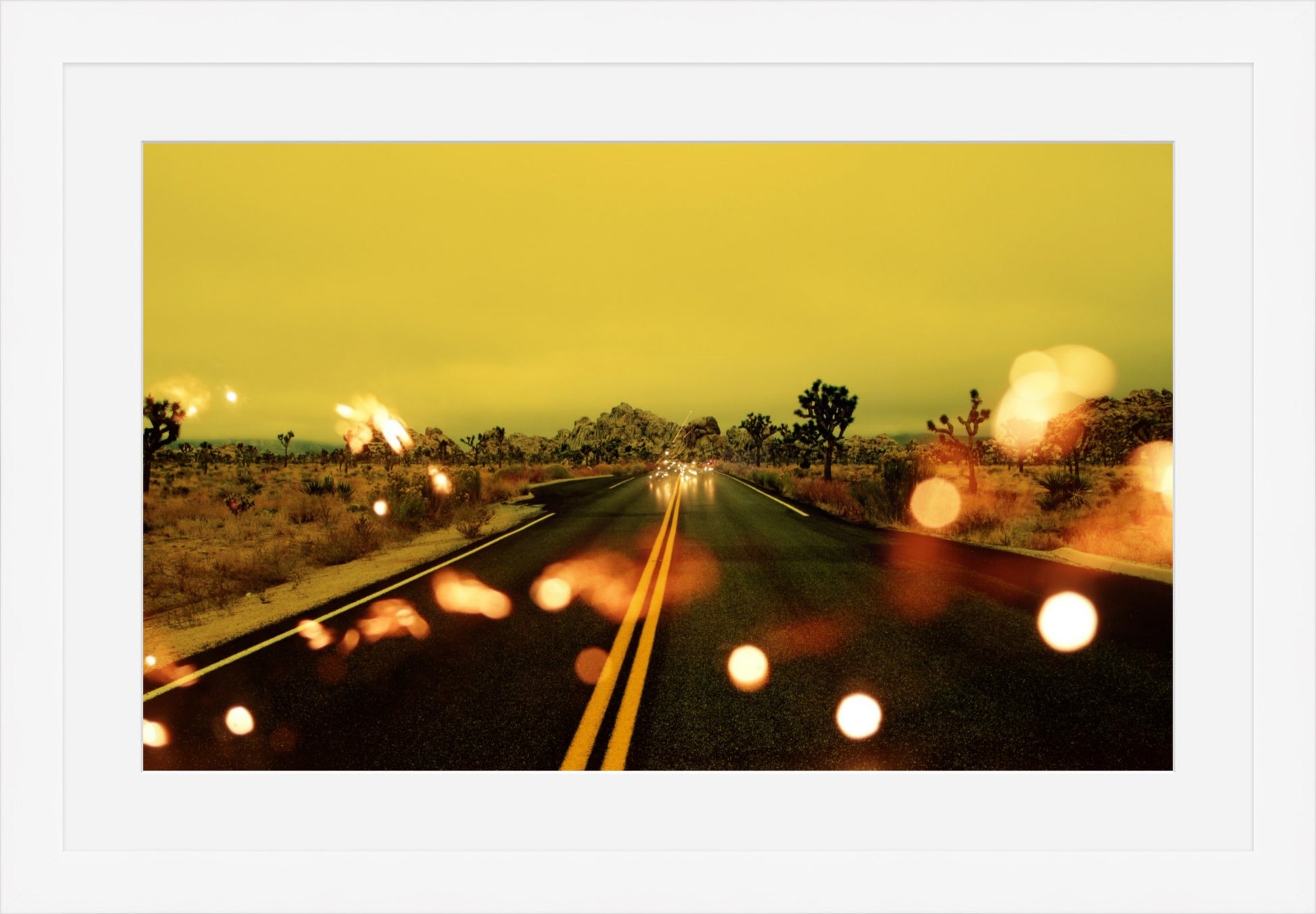 "Light Theory VI" distills the mythology of the American West into a single, graphic perspective. The double yellow lines of Joshua Tree cut through the organic desert floor, creating a stark, architectural vanishing point. Layered with kinetic anomalies of light, the road becomes more than a path—it is a conduit for energy, pulling the viewer toward an infinite, warm horizon.