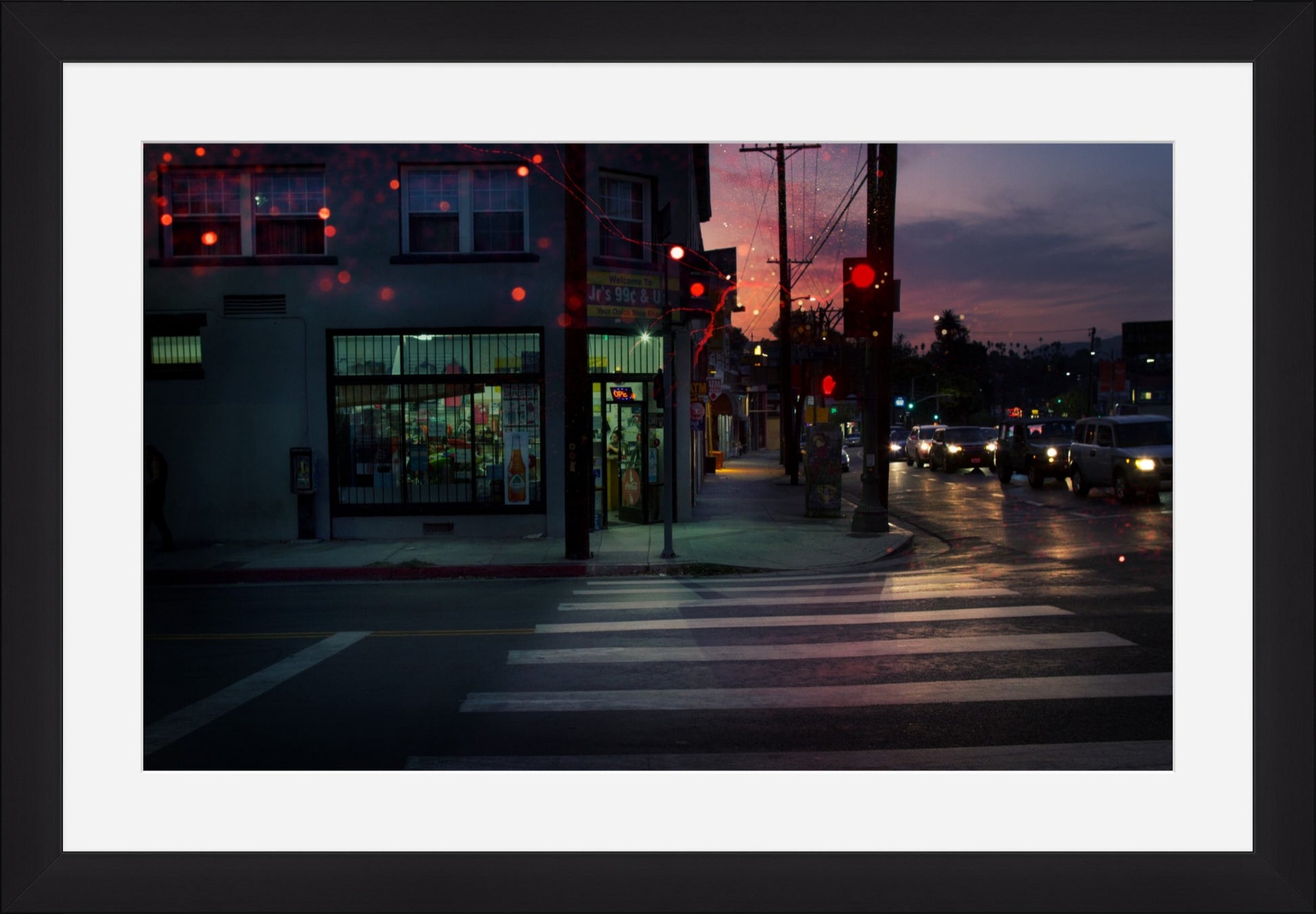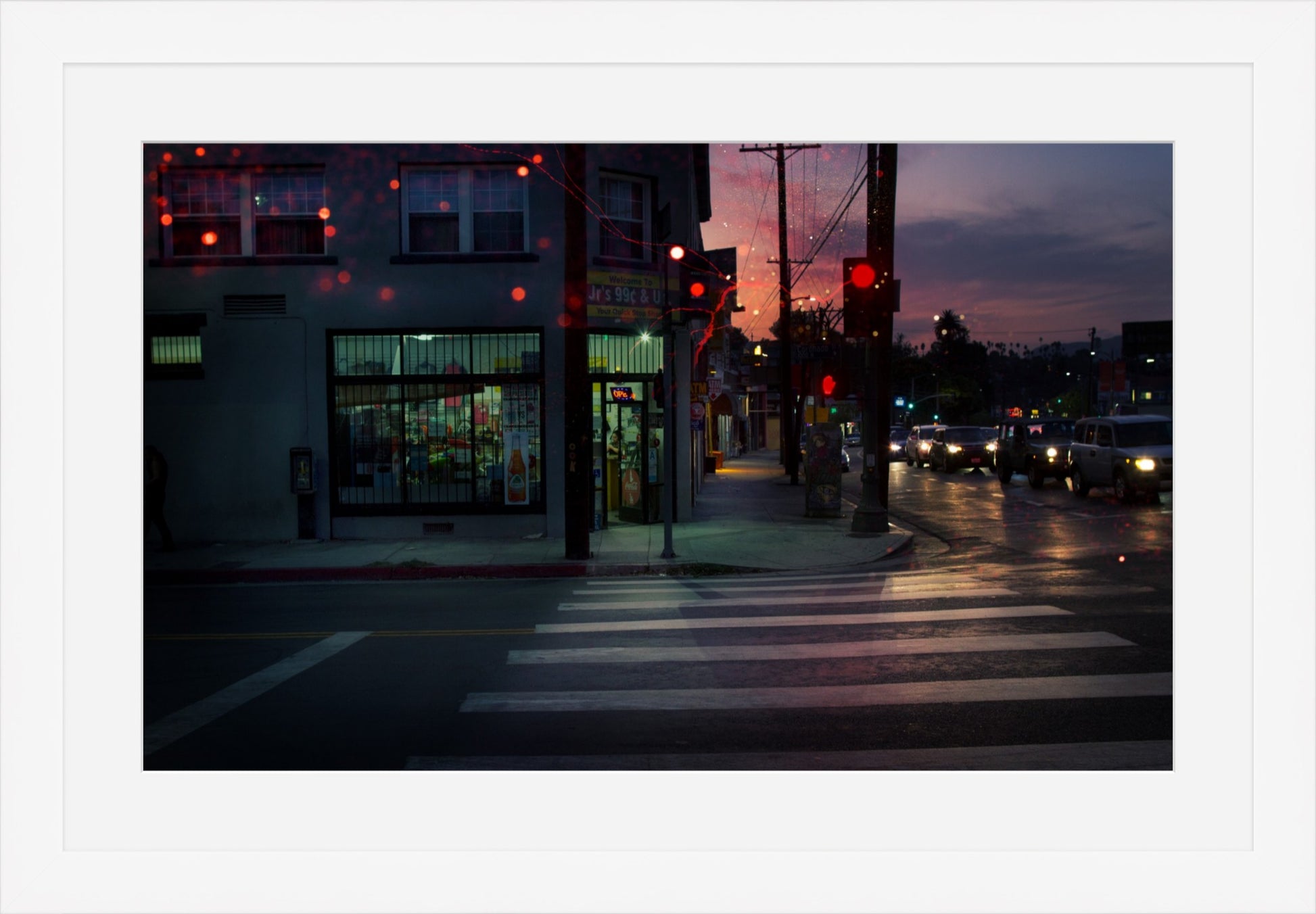 "The Echoes Archive: IV" is a study in Los Angeles noir. Set against the shadowed corridors of Sunset Boulevard in Echo Park, this piece captures the electric tension between the city’s familiar grit and a fleeting moment of surreal light. It transforms a mundane sidewalk scene into a cinematic stage, freezing the unpredictable energy of the night into a permanent, haunting stillness.