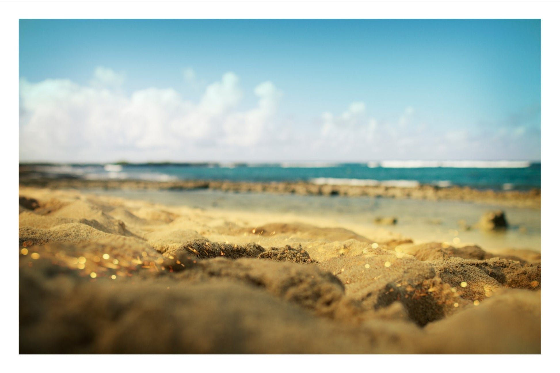 In "The Radiant Shore," the focus is pulled low to the Hawaiian sand, blurring the horizon into a soft, tranquil backdrop of sea and clouds. Overlaid sparks of light dance across the frame, adding a layer of energy to the peaceful environment. The piece explores the natural solitude of the shore, stripping away the noise of a typical beach landscape to reveal the vibrant, quiet beauty that exists within the details.